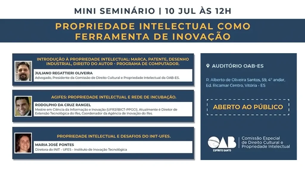Nosso sócio-diretor, Juliano Regattieri Oliveira, participou como palestrante de um importante evento sobre Propriedade Intelectual, realizado na sede do SEBRAE-ES. O evento, intitulado MINDSET INOVADOR, destacou temas relevantes como a Importância da Propriedade Intelectual para a Competitividade e Inovação nas Empresas. Durante sua apresentação, Juliano Regattieri abordou conceitos fundamentais de Propriedade Intelectual, explicando o processo de Registro de Marcas no INPI (Instituto Nacional da Propriedade Industrial) e sua relevância estratégica para as empresas. Ele também discorreu sobre o papel das Patentes no processo de inovação e como o Design pode agregar valor aos produtos. “As marcas e patentes são os mecanismos de apropriação industrial mais utilizados pelos brasileiros. Fizemos questão de destacar o Desenho Industrial como uma ferramenta estratégica no marketing, incentivando seu uso também por micro e pequenas empresas”, destacou Regattieri. Ele também reforçou a importância de buscar suporte especializado: “Muitos empresários desconhecem que existem empresas especializadas em registro de marcas aqui no Espírito Santo. A Vitória Marcas e Patentes, por exemplo, oferece atendimento personalizado e próximo para os empresários da região.” O evento contou ainda com a participação de renomados profissionais, como: · Dra. Flávia Dalla Bernardina, advogada e membra da Comissão; · Vinicius Câmara, representante do INPI vindo do Rio de Janeiro; · Gabriel Fabres Beliqui, que abordou Indicações Geográficas e Marcas Coletivas; · Francisco Pellegrini, que trouxe insights sobre a gestão da Propriedade Intelectual em micro e pequenas empresas. A mediadora do evento, Dra. Cecilia Häsner, Mestre em Propriedade Intelectual, destacou a importância do encontro: “Foi um marco para o Espírito Santo. Uma oportunidade única de reunir especialistas de diversas áreas da Propriedade Intelectual para discutir casos concretos e estratégias de promoção da competitividade das empresas capixabas, especialmente as de pequeno porte, visando o desenvolvimento econômico do Estado.” Juliano Regattieri também aproveitou a ocasião para divulgar o curso Propriedade Intelectual & Indústria Farmacêutica, promovido pelo IDS – Instituto Dannemann Siemsen. Com início previsto para 30 de setembro, o curso abordará temas como Marcas, Patentes, Trade Dress, questões regulatórias com a Anvisa e Proteção de Dados. Advogados inscritos na OAB-ES terão 20% de desconto. Interessados podem obter mais informações pelo e-mail [email protected]. Sobre Juliano Regattieri Oliveira: Juliano é advogado, especialista em Propriedade Intelectual, presidente da Comissão de Propriedade Intelectual da OAB/ES, membro da Comissão de Direito Empresarial da OAB/ES e conselheiro do CONECT – Conselho de Economia Criativa da FINDES – Federação das Indústrias do Estado do Espírito Santo