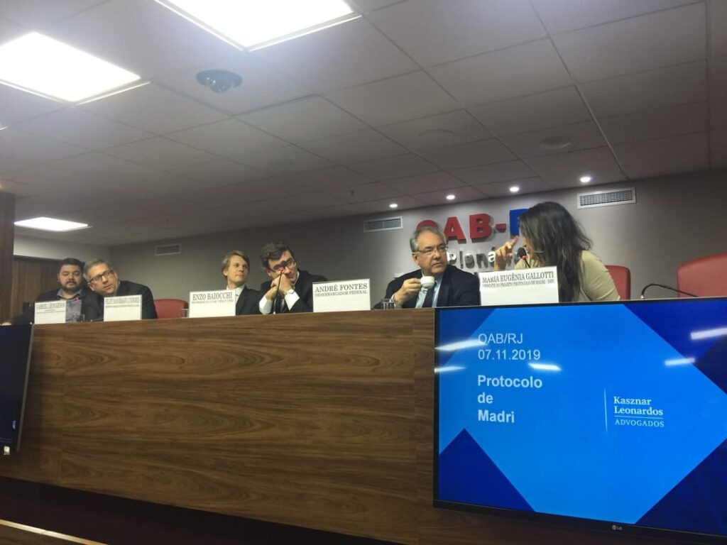 O advogado e sócio da Regattieri Marcas e Patentes, Juliano Regattieri, esteve presente em um evento realizado no Rio de Janeiro pela Comissão de PI da OAB-RJ para discutir sobre registro internacional de marcas na quinta-feira (07/11/2019). O tema do evento foi “Sistema Internacional de Registro de Marcas: O Protocolo de Madrid e sua implementação no Brasil: desafios e oportunidades”. Os palestrantes foram o desembargador federal, André Fontes, a gerente do Projeto Protocolo de Madrid (INPI), Maria Eugênia Gallotti e o conselheiro federal e presidente da Comissão de Propriedade Intelectual da OAB Gabriel Leonardos. O debatedor do evento foi Vinícius Bogéa Câmara (INPI). Também fizeram parte da mesa, o presidente da Comissão Felipe Dannemann Lundgren e o professor da UCAM, da UERJ e da UFRJ, Enzo Baiocchi. “Foi um evento de muito boa qualidade. O Protocolo de Madrid começou a vigorar aqui há pouco mais de um mês e é natural que muitas questões surjam com o passar do tempo. É tudo muito novo para os usuários do sistema aqui no Brasil”, destacou Juliano Regattieri. “Para quem trabalha com o registro de marca em outros países, como é o caso do nosso escritório, a adesão ao Protocolo de Madri foi muito importante”, finalizou.