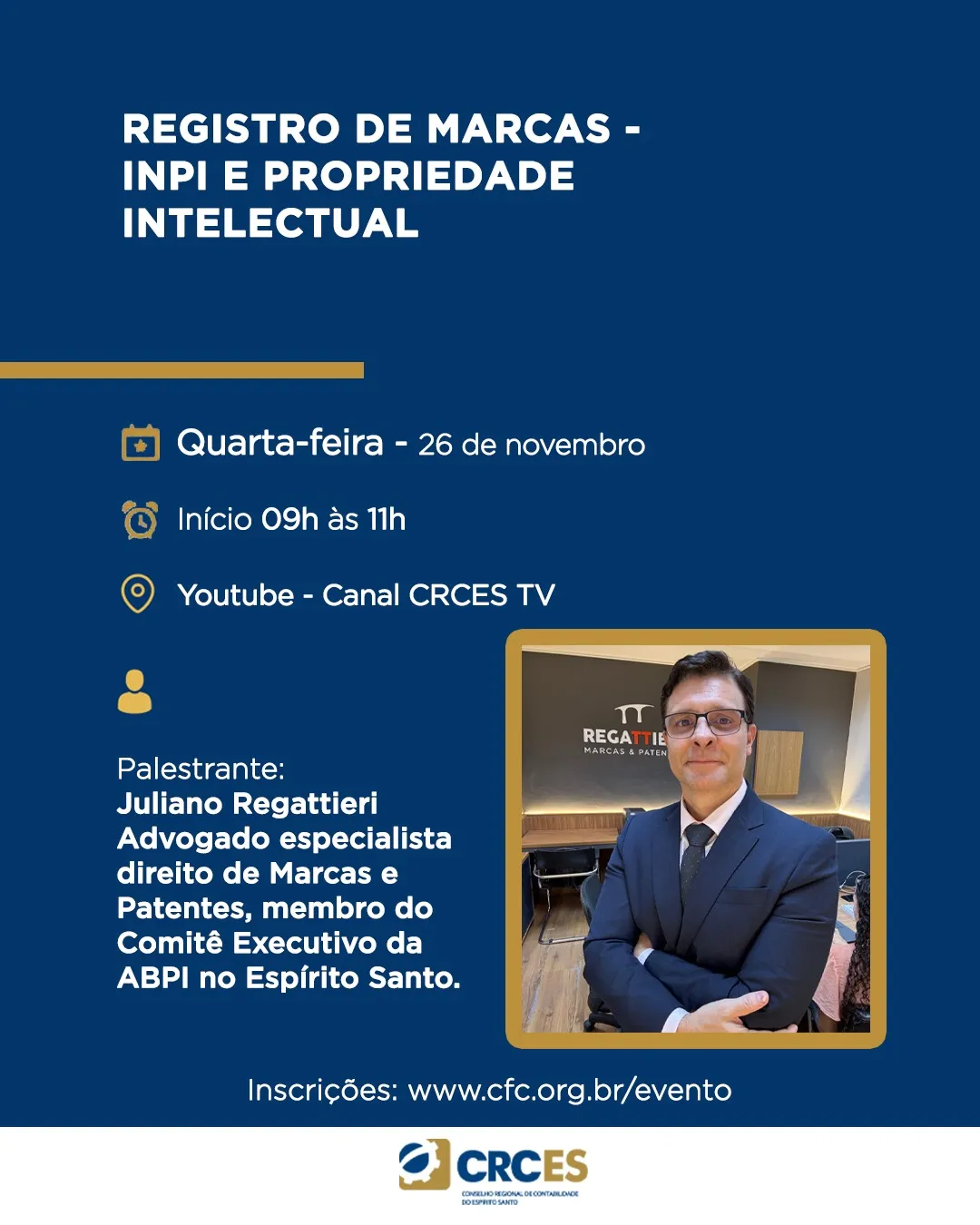 O especialista em registro de marca no INPI, Juliano Regattieri Oliveira, ministrará palestra para profissionais da contabilidade, visando à atualização, o desenvolvimento e o aprimoramento contínuo da classe, em conformidade com o Programa de Educação Profissional Continuada do CRC-ES.